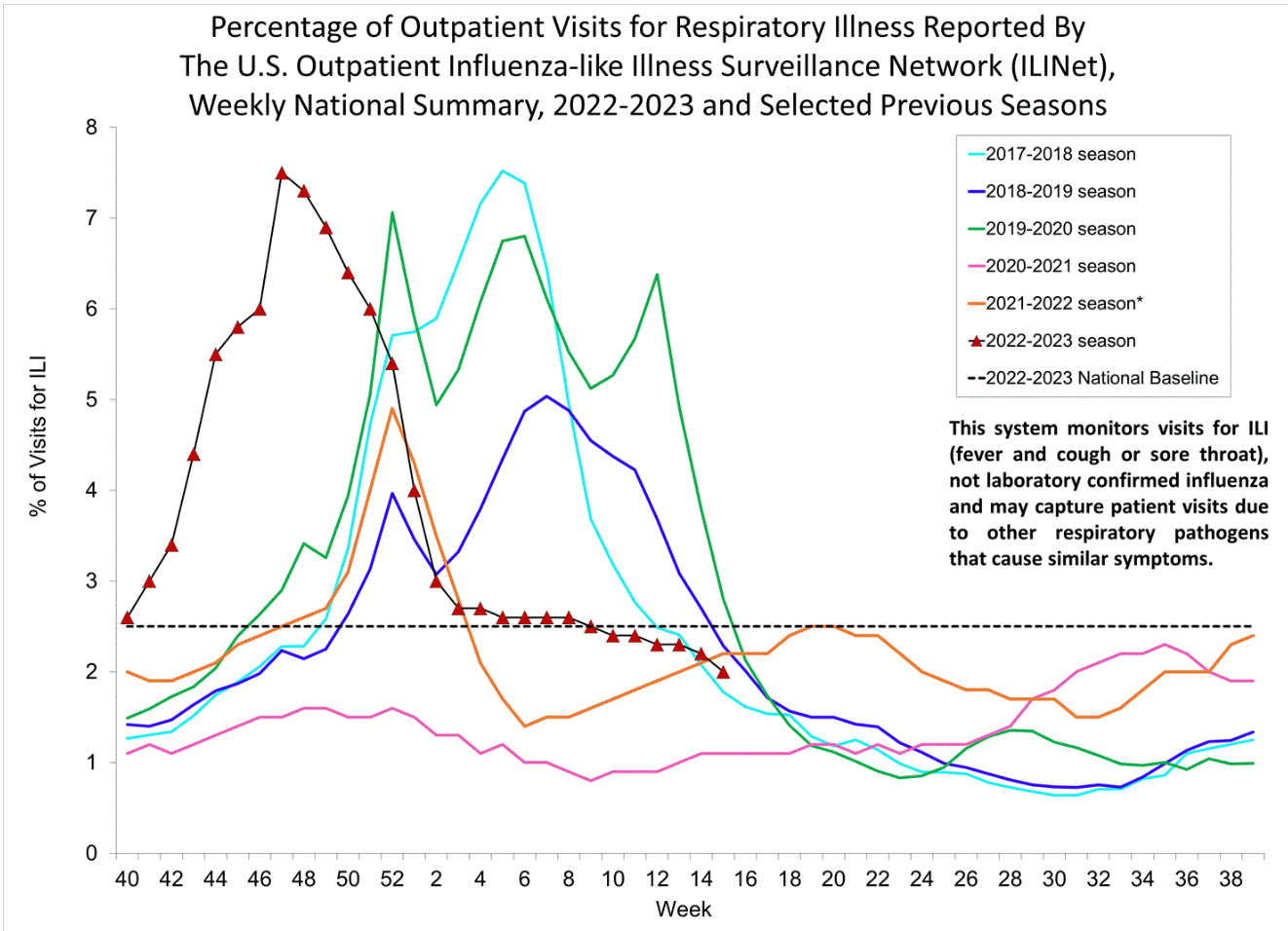 I’m glad to be able to put good news in your inbox this week. Influenza-like illness (ILI) activity fell again this week, to 2% of outpatient visits for fever and cough or sore throat. We’ve seen continued declines week over week for about six weeks now. Even young children, whose ILI activity has remained stubbornly high the entire season, declined from 7.3% to 6.9% during the last reporting period.