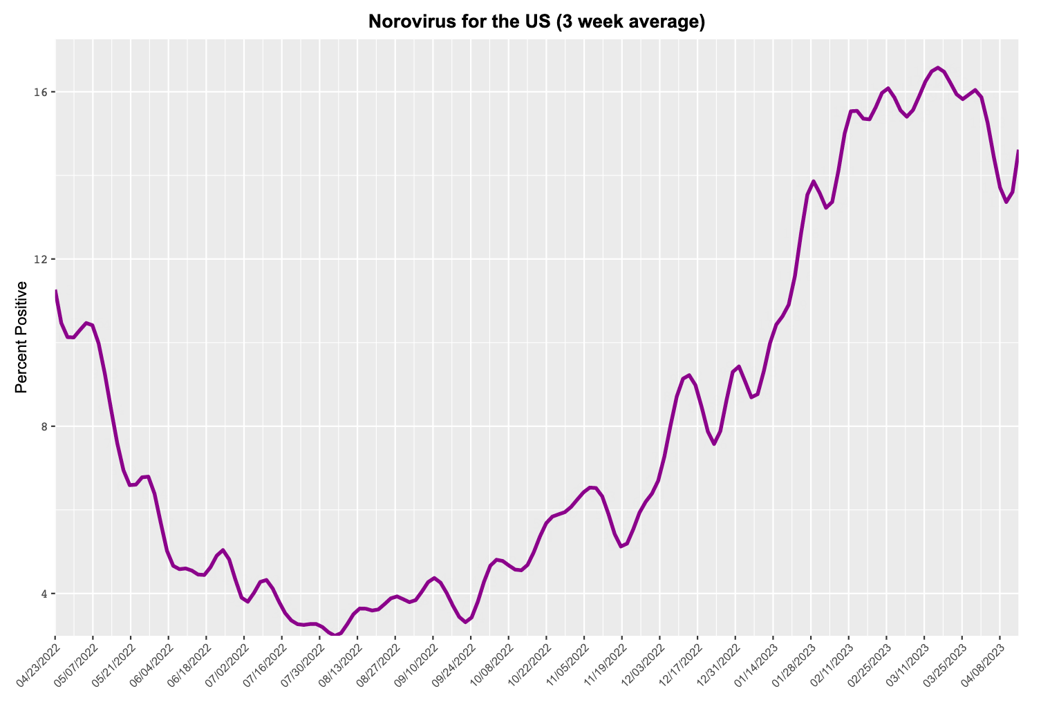 Norovirus must have heard me last week when I said it was finally fading. Activity is back up this week. The Southern region is looking good, but the other three big regions are still struggling to turn the corner.