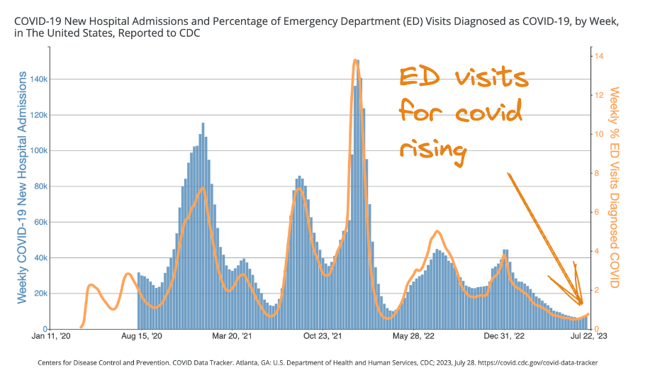 Hospitalization indicators are increasing as well. The number of people admitted to the hospital with Covid-19 rose for the first time in months last week, and the proportion of emergency department visits that are diagnosed as COVID-19 is also increasing. Test positivity is now at 7.6%, up from a recent low of 4.1%.