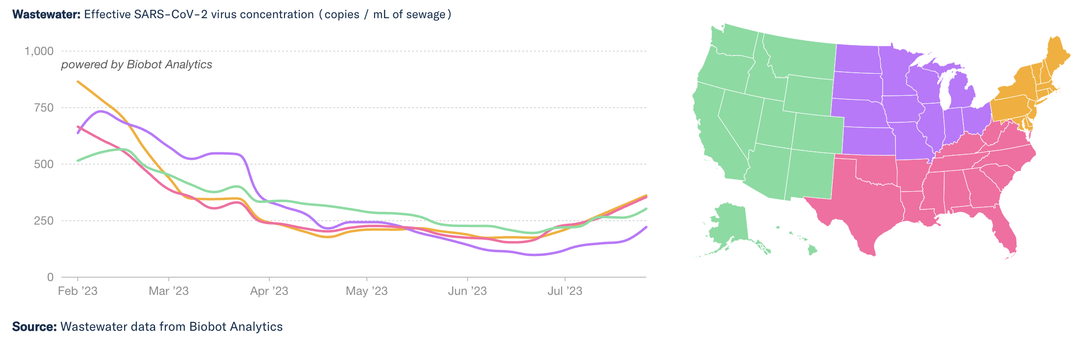I’m still seeing signs of a summer Covid-19 wave. Wastewater concentration is up again this week, now in all four regions of the country. The Northeast and Southern regions continue to be most affected, following by the West and Midwest.