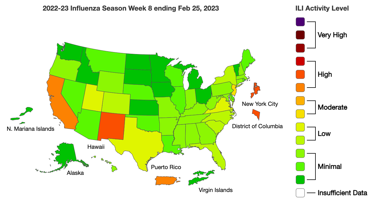 There are five jurisdictions in the red zone this week, up from four last week. California joins New Mexico, Puerto Rico, District of Columbia, and New York in the high category. Most of those jurisdictions have been stuck in high for many weeks now, in what I’m sure is a prolonged frustration for parents, healthcare providers, and others who directly experience the impacts of flu season.