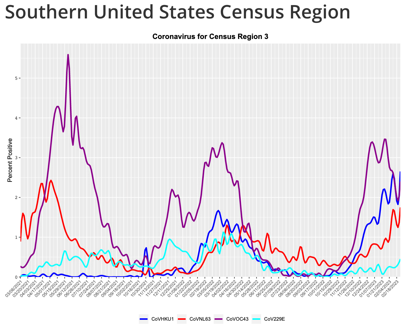I’ve been watching the seasonal coronaviruses for a few months now. Seasonal coronaviruses cause cold-like symptoms. An interesting trend has emerged at the regional level. Activity has begun to rise again in the midwestern and southern regions after dipping earlier this month. The western region has been high and remains high (unfortunately). Only the northeastern region shows sustained progress in declining activity.