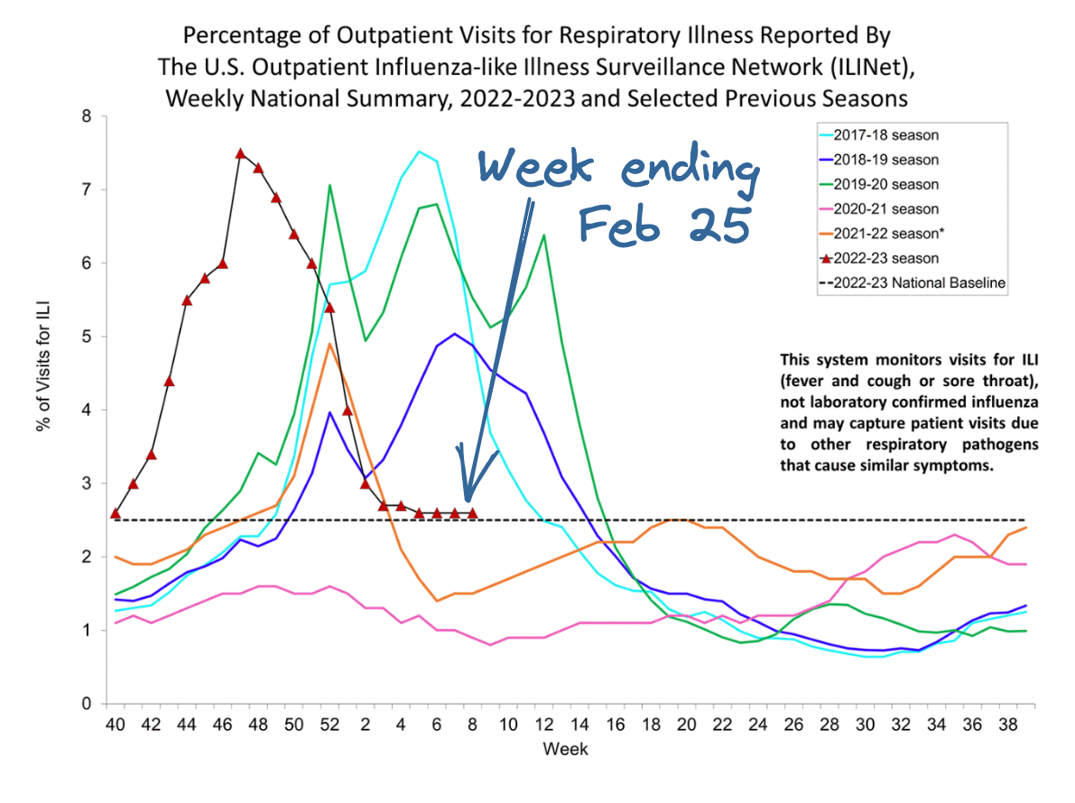Influenza-like illness (ILI) activity remained flat this week (again! still!), with 2.6% of outpatient visits to medical providers for ILI. This is quite an unusual pattern, and I’m very curious to see how it will play out in the coming weeks.