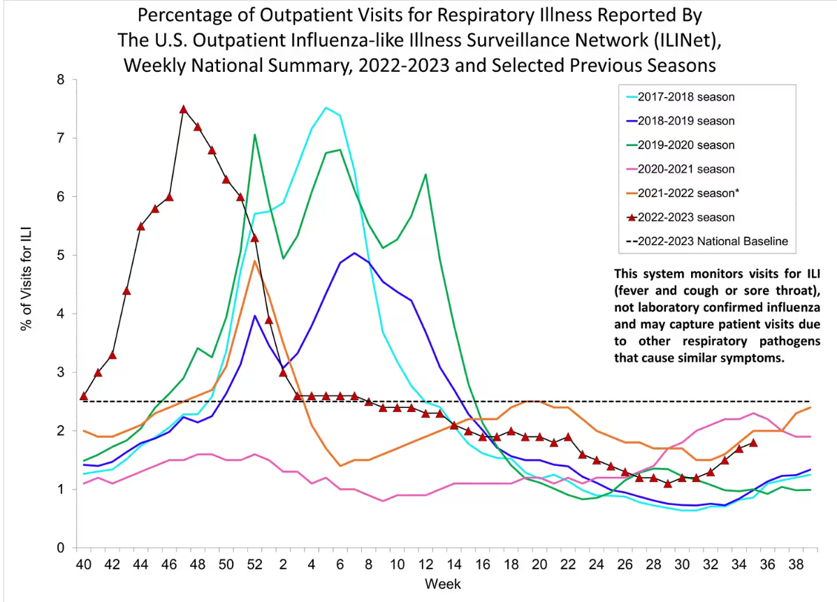 Many state health departments will activate their flu surveillance systems in October, which is one way to mark the beginning of the flu season. The other is when ILI activity crosses the threshold of 2.5% of visits to the doctor for ILI. (We are at 1.9%, so not there yet. )Last year we crossed that line in early October, but most years it doesn’t happen until November or even December. As the name suggests, influenza-like illness surveillance is not specific to influenza. Any visit to the doctor for fever and cough or sore throat qualifies, so it can be a mix of bugs.