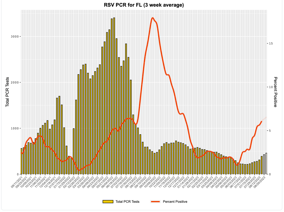 RSV is definitely gearing up in certain parts of the country. The Southern region got an early start this year, and according to the latest CDC report, activity there continues to increase. In Florida, for example, trends are looking similar to last year’s significant wave. Activity in Georgia, Alabama, Texas, and other Southern states is also increasing steadily.