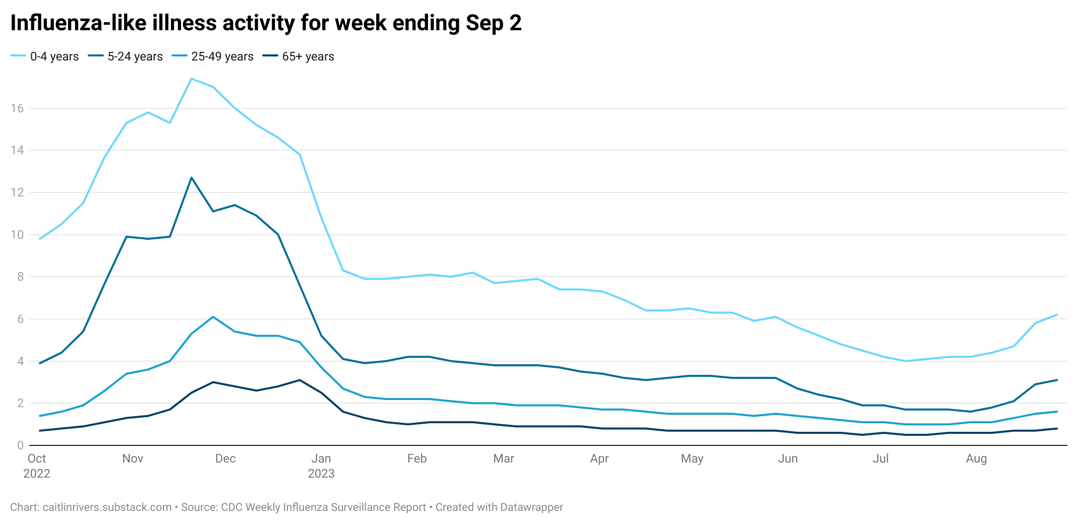 Influenza-like illness (ILI) rose slightly during the last reporting period to 1.9% of visits to the doctor for fever and cough or sore throat, inching us closer to the start of flu season. Much of the South now rates as “mild” for ILI activity, up from “minimal.” Young children continue to be particularly affected, with the most recent report showing an increase in ILI activity in children aged 0-4 from 5.8% to 6.2%. While all other age groups experienced a slight increase, it was less significant.