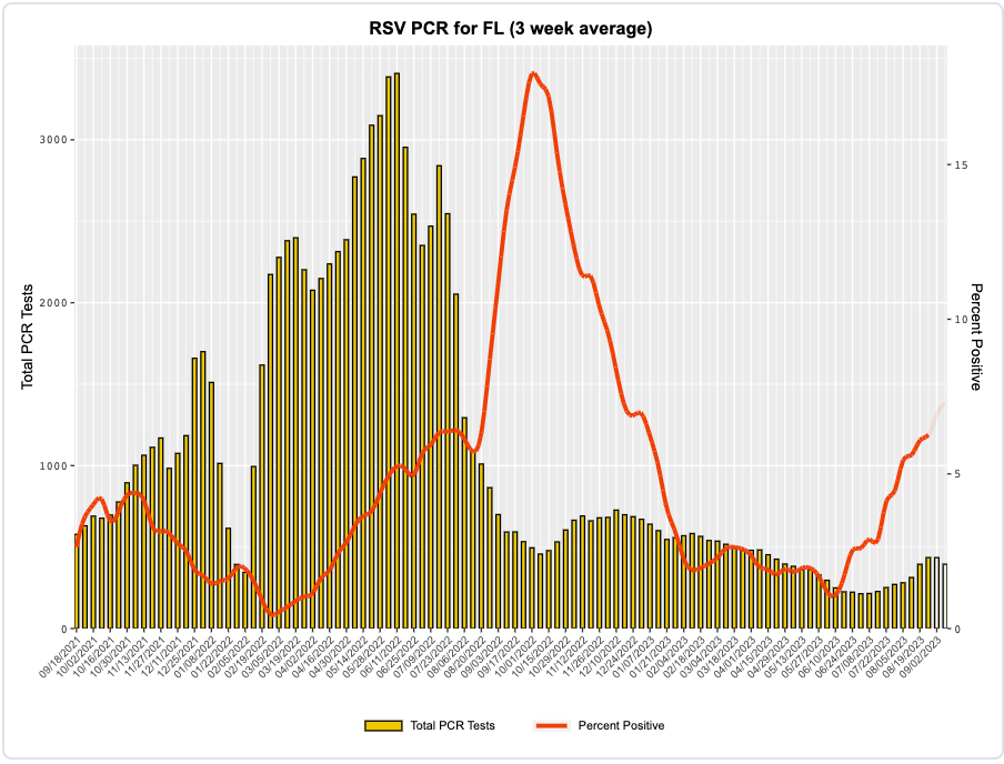 RSV cases are increasing, particularly in the South. In Florida, currently around 8% of PCR tests show positive results for RSV, a jump from 2% in June. During peak winter, this figure can climb over 15%. While RSV test positivity is also going up in other Southern states, as well as in New England and the West, the activity remains comparatively lower. Overall, I would say that activity is moderate in the South Atlantic region and low but heading in the wrong direction in the other regions I mentioned.