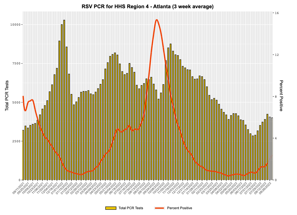 CDC pushed out a Health Alert Network advisory on increased RSV activity in Southeastern states earlier this week. I’ve been reporting on the same trends for several weeks now here on Force of Infection. This week is more of the same, with activity still rising in the Southeastern region. I’m also seeing some signals in the Southwest and Midwest, though it’s too early to tell if they are significant. I’ll let you know how things develop in the weeks to come.