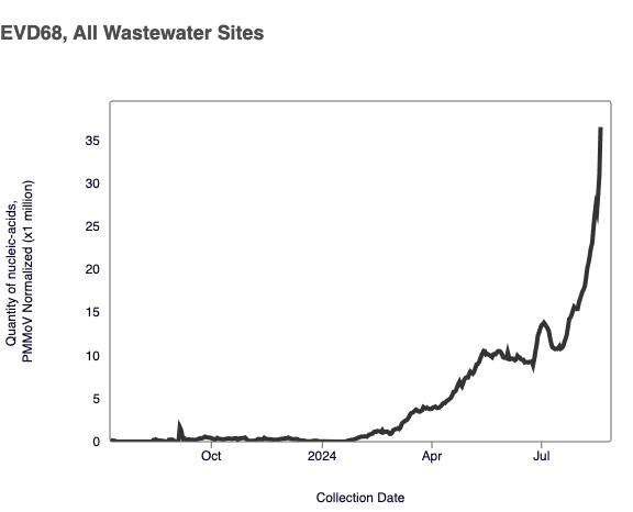 It's worth noting that we haven't seen a spike in AFM cases yet according to CDC data, but the most recent data only goes up to August 1st. The increase in wastewater detection is more recent. September has historically been a common month for AFM spikes, so the timing fits the pattern we've seen in previous years.
