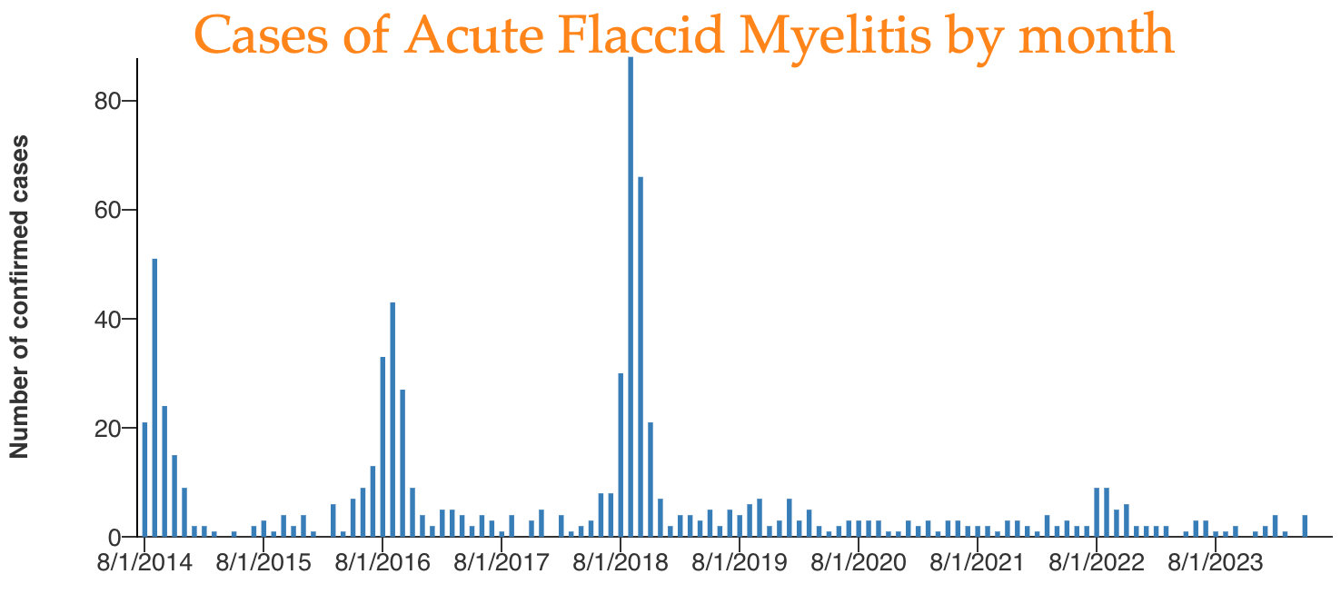 AFM diagnoses spiked in 2014, 2016, and 2018, suggesting a possible every-two-year pattern. However, pandemic control measures interrupted transmission of many common viruses, including EV-D68, and so very few AFM cases were recorded in 2020 and 2022. Now the spike in wastewater makes me wonder whether this year will mark a return of AFM.
