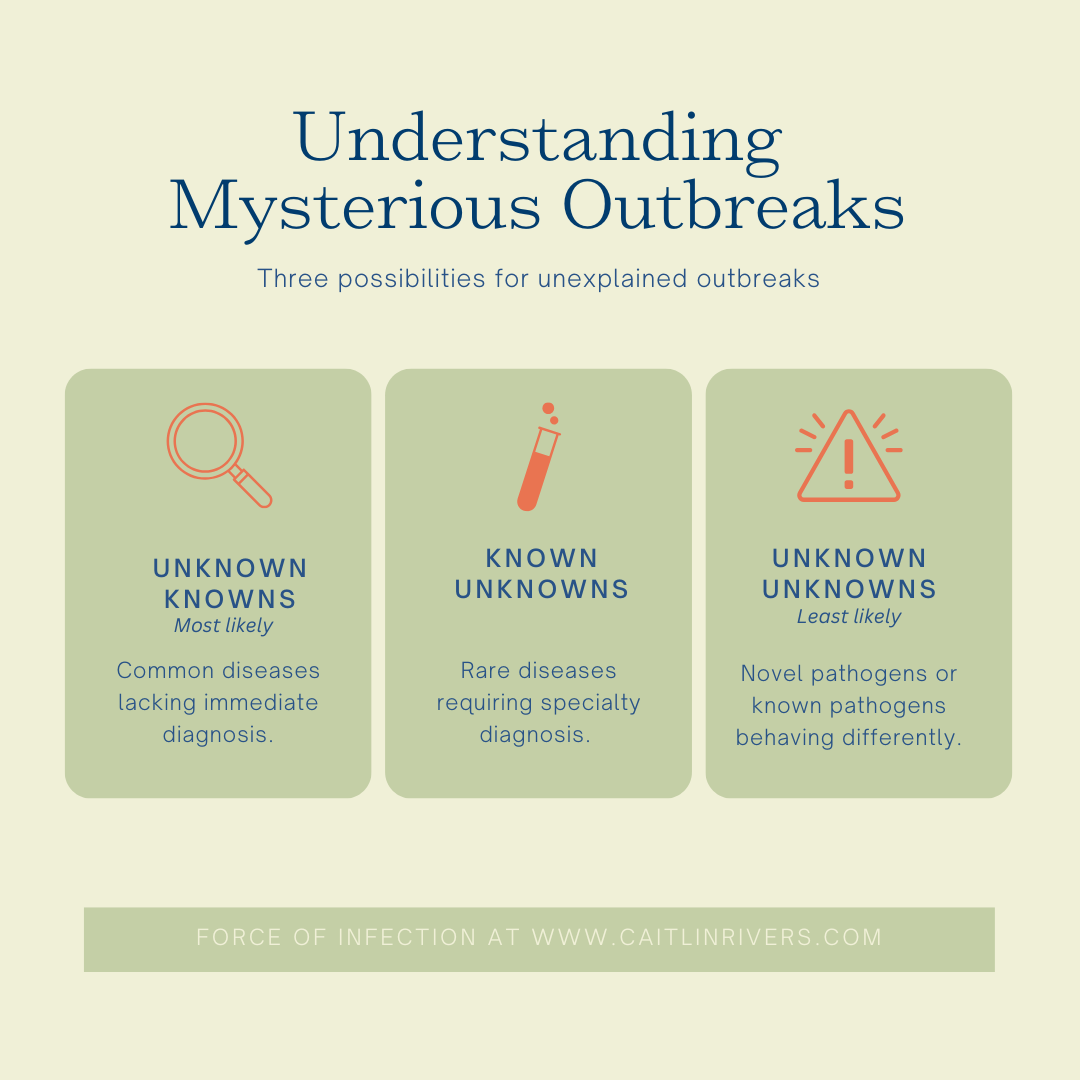As an epidemiologist, I tend to group “unidentified” outbreaks into three main possibilities. While just a rough sketch, this loose approach provides a useful starting point for assessing mysterious events, while waiting for more information to come in.