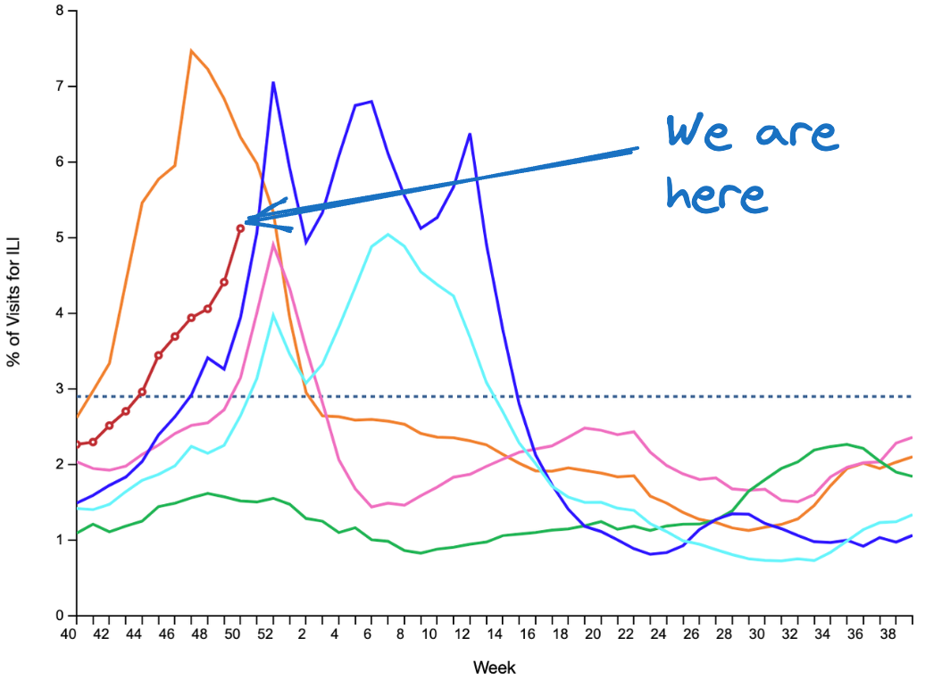 Influenza-like illness is increasing quickly, with 5.1% of visits to the doctor for fever and cough or sore throat, up from 4.4% the week prior. The entire Southern region and most of the Western region are seeing very high levels of activity. New England is also heating up, with New York City in the very high category and other jurisdictions at moderate or high. The Midwest still looks pretty good, but activity is definitely increasing there as well.