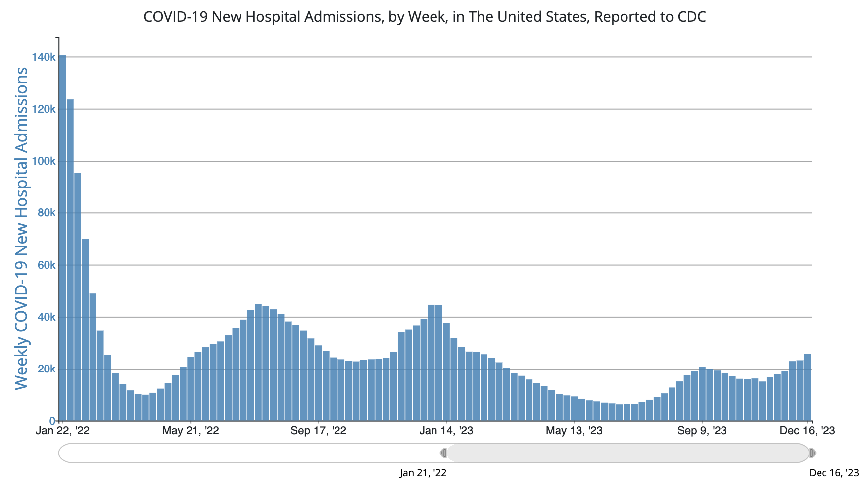 Covid-19 activity is also rising. The number of new weekly hospitalizations has climbed to over 25,000, up from a recent low of around 15,000 (note: this data is as of December 16, so it’s a little out of date). However, we are still far below last winter’s peak. The Midwestern and Northeastern regions have the highest rates of hospitalization, and those regions also have the highest wastewater concentration. People over the age of 70 are still at highest risk of hospitalization.
