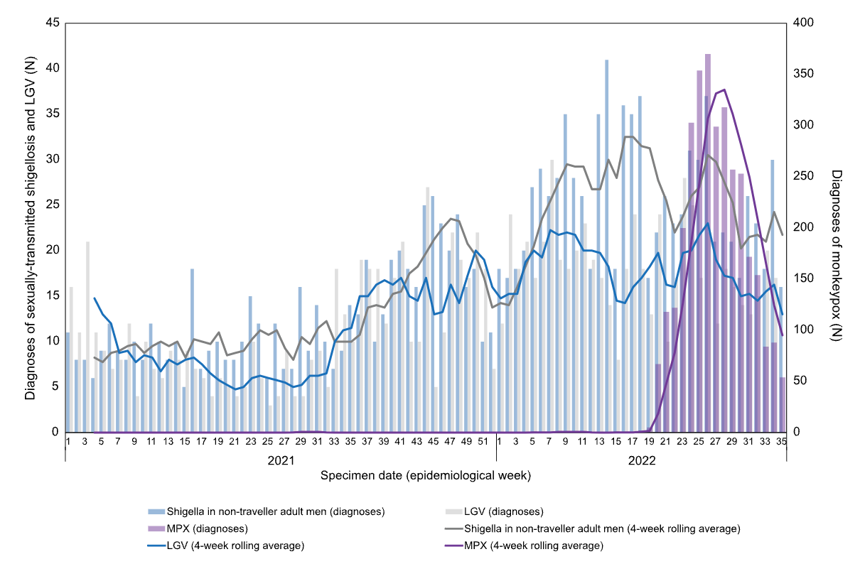 Additional evidence comes from the latest technical report out of the UK Health Security Agency. Epidemiologists there took a clever approach to get at the question of whether the recent downturn is attributable to behavior. They looked at the number of new diagnoses of Shigella and lymphogranuloma venereum (LGV), both infections spread through close contact that disproportionately affect MSM populations. If improvement in the monkeypox epidemic was attributable to vaccination, transmission of those diseases would be unaffected. Results show a modest decrease in the number of new Shigella and LGV cases, suggesting that in fact behavior is playing a role.