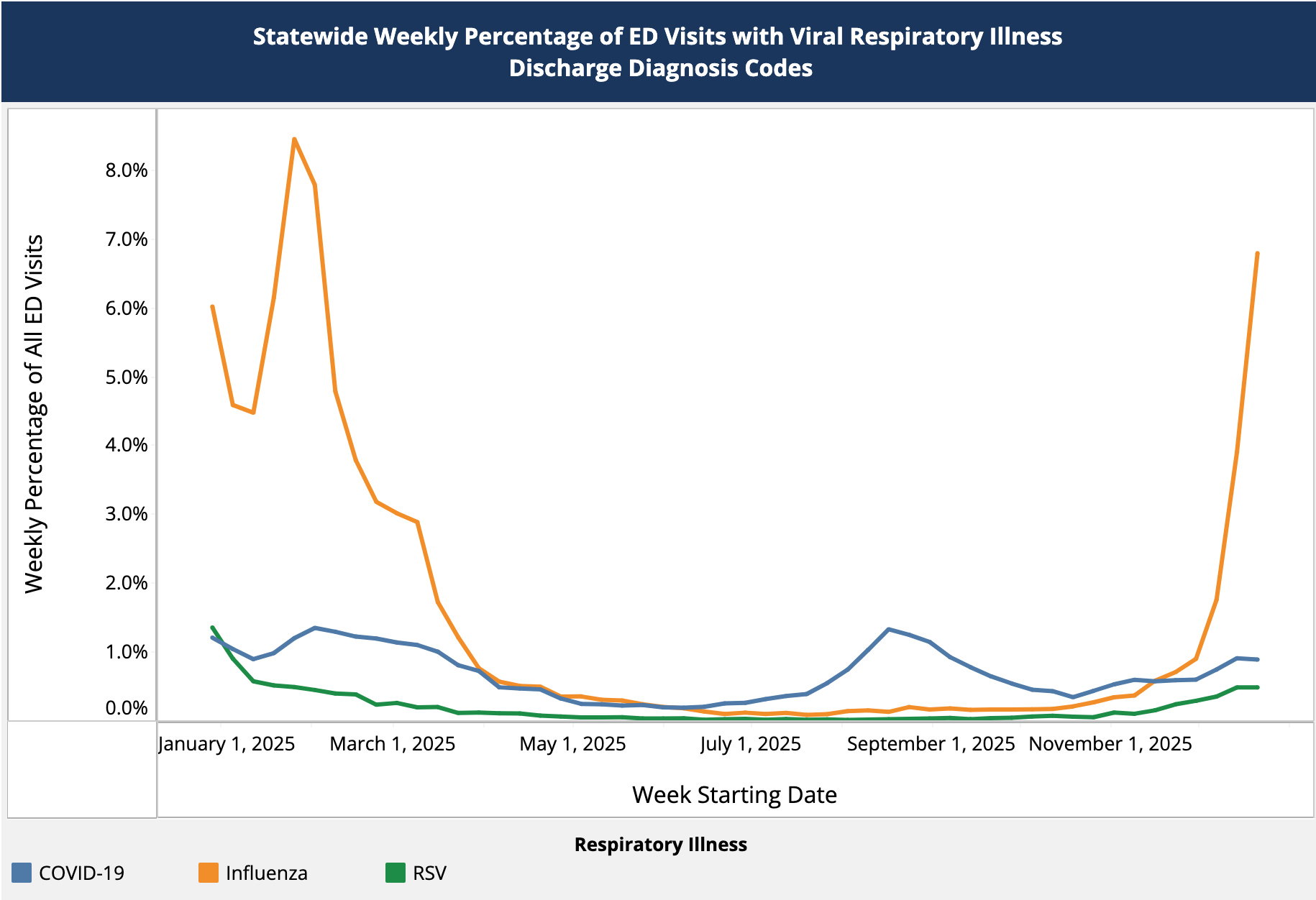 In Kansas, after several weeks of increasing ED visits for children under the age of 13, rates dipped slightly this past week to 0.9%. RSV has held steady at ~0.3-0.4% of ED visits for the past month in Hawaii, and rates remain similarly low and flat in Nevada, Virginia. In Colorado, ED visits remain extremely low at just 0.1%.